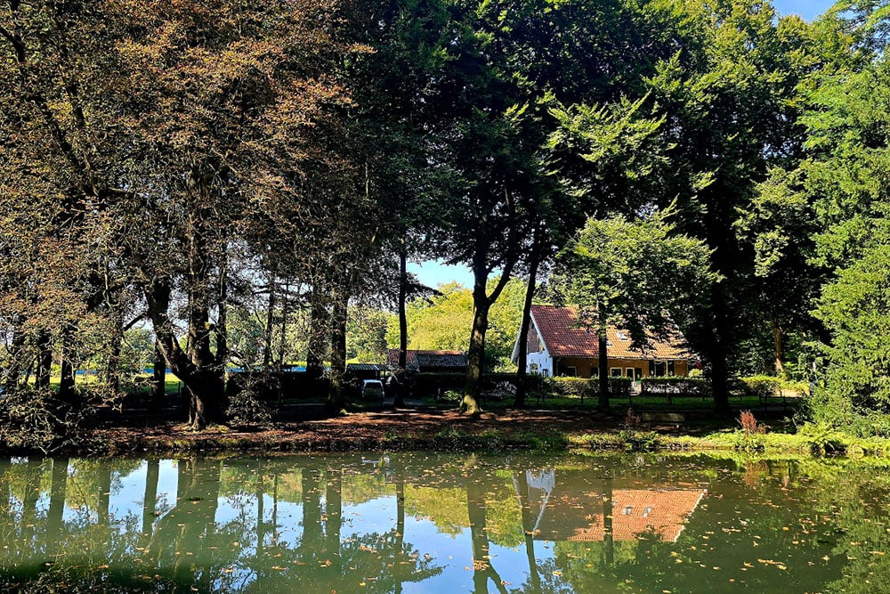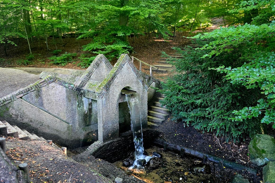 Het rode klompje op de paaltjes dirigeert ons de Hemelse Berg op. Een behoorlijke klim waarna we weer afdalen langs een diep ravijn. Een plek die bekendstaat als ‘De Hel’. Verderop wordt het echt idyllisch, een klaterende sprengenbeek trekt direct je aandacht. Je passeert meerdere houten bruggetjes langs watervalletjes. Een ervan is bijzonder, namelijk ‘Het Grothuisje’, gebouwd van mislukte bakstenen.